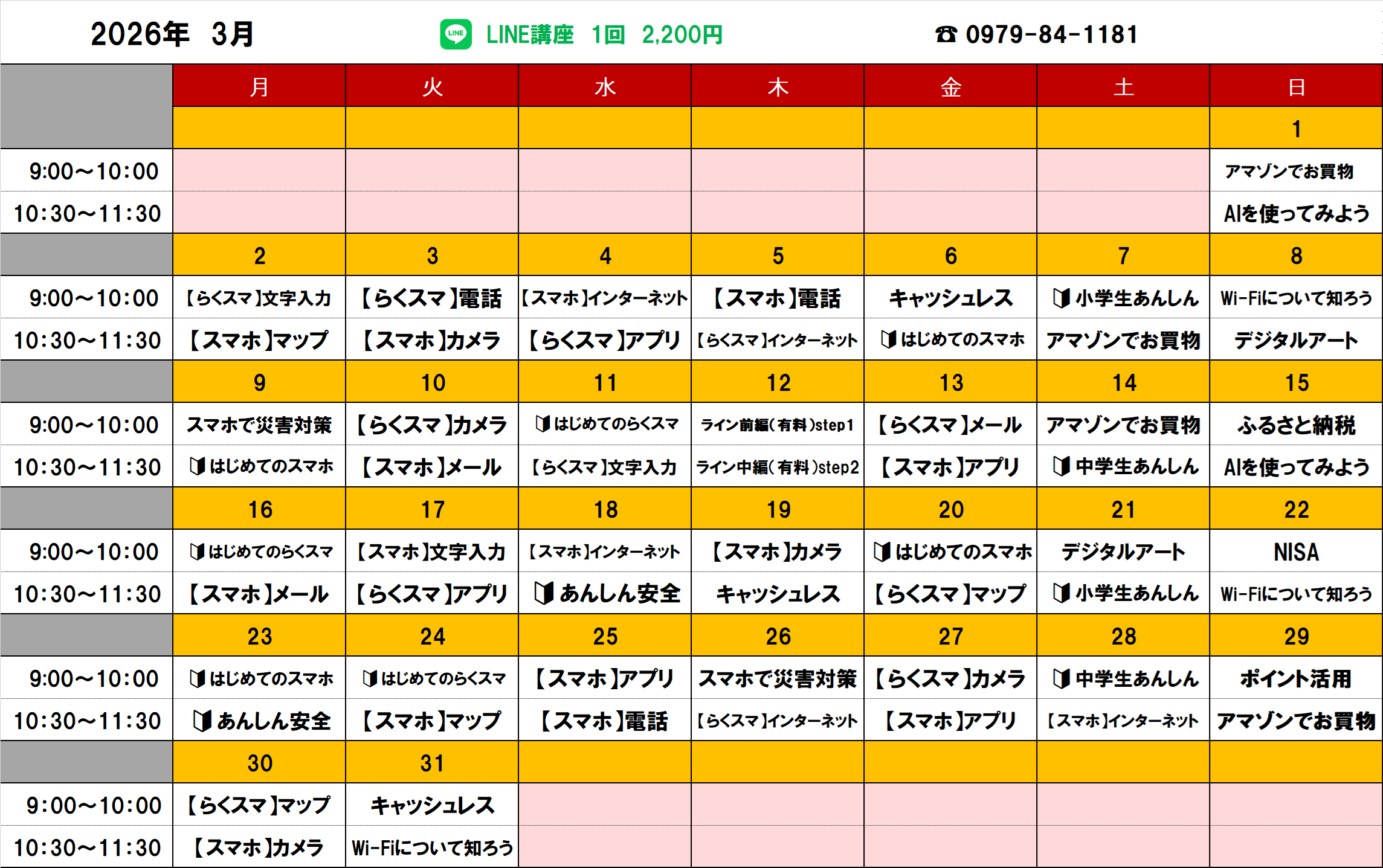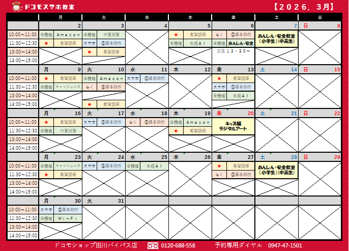 3月のスマホ教室スケジュール(ドコモショップ田川バイパス店)
